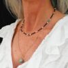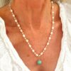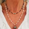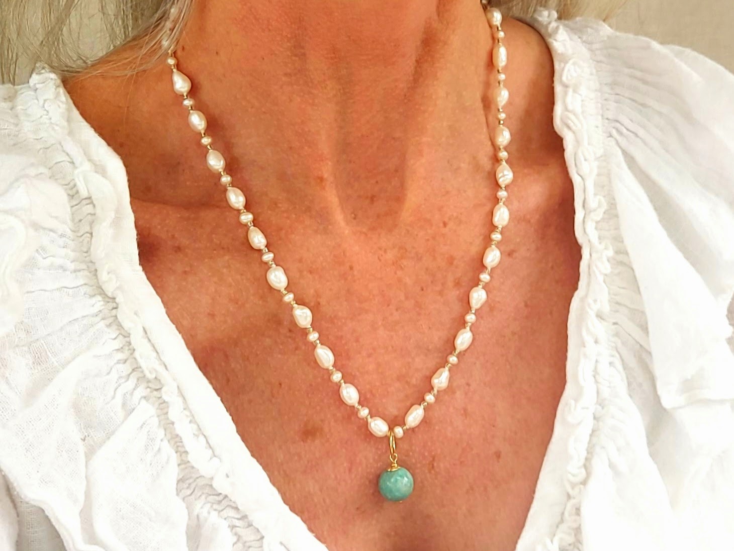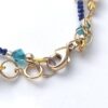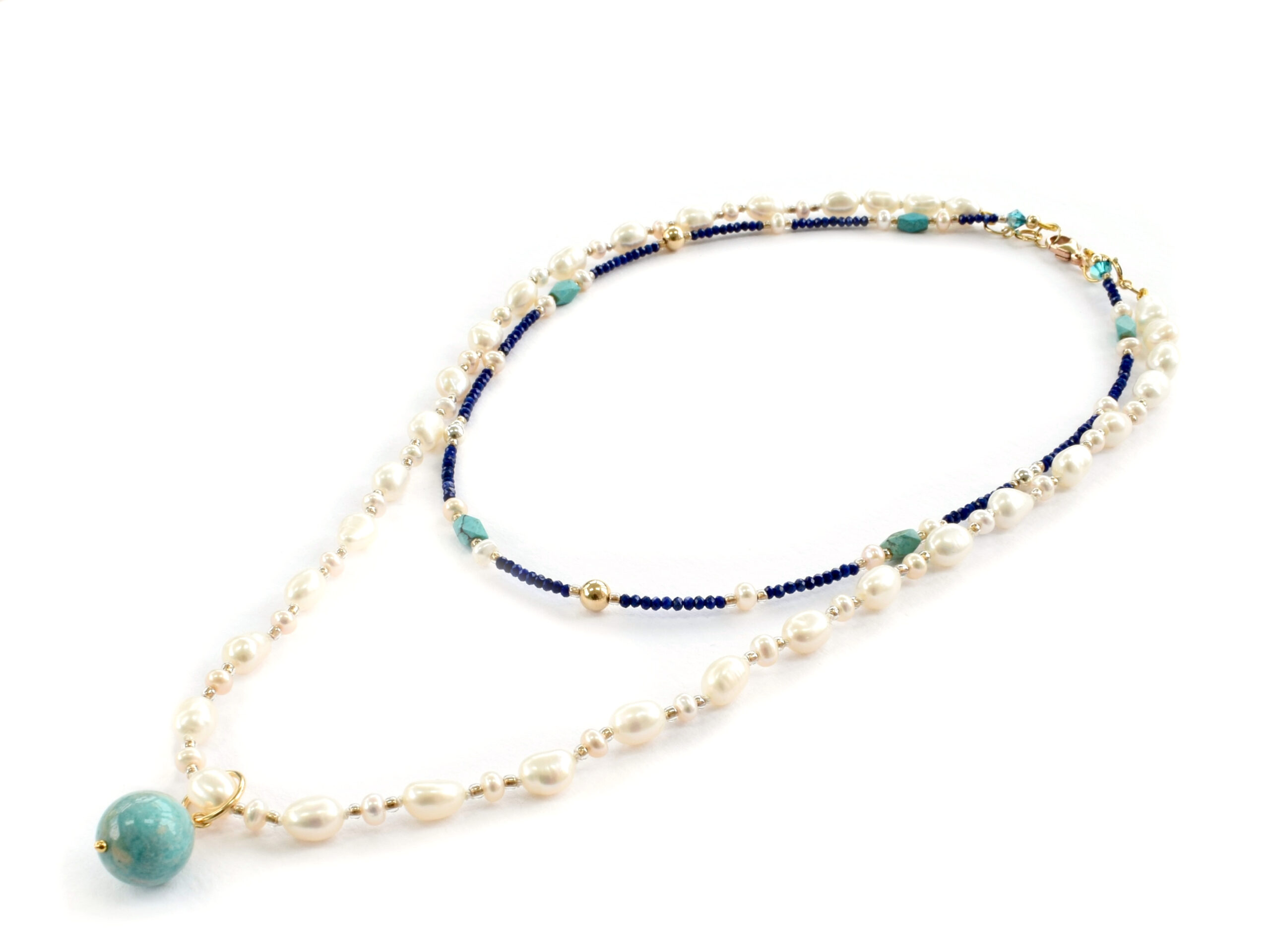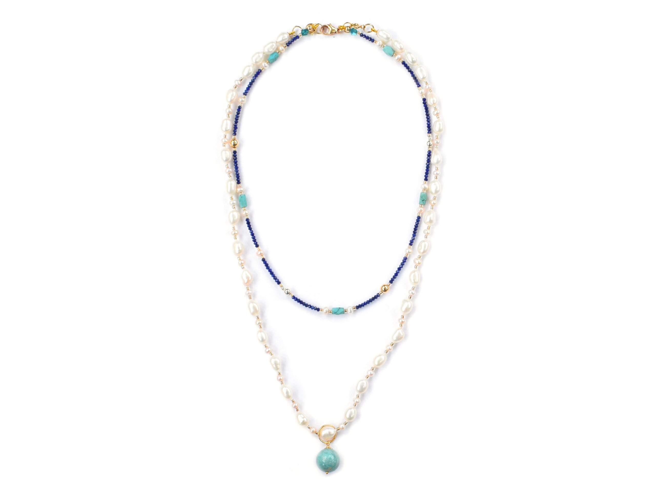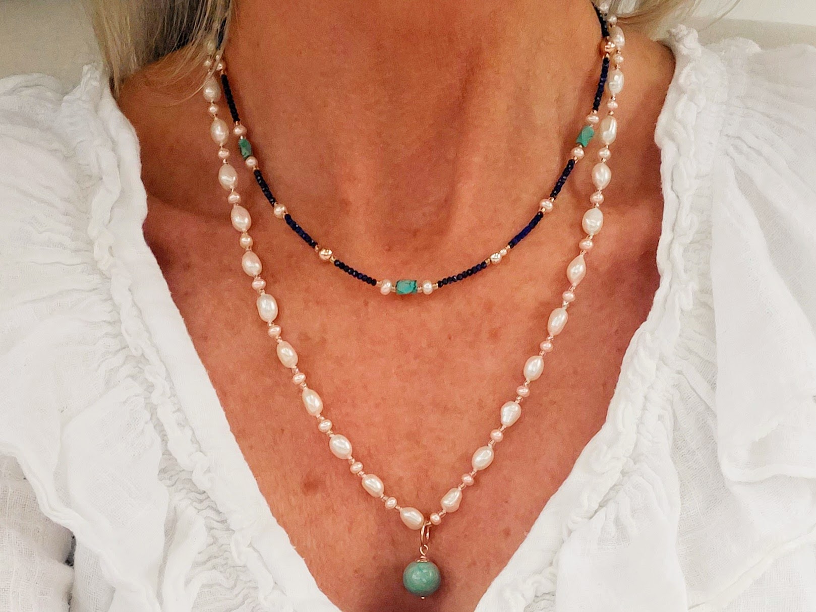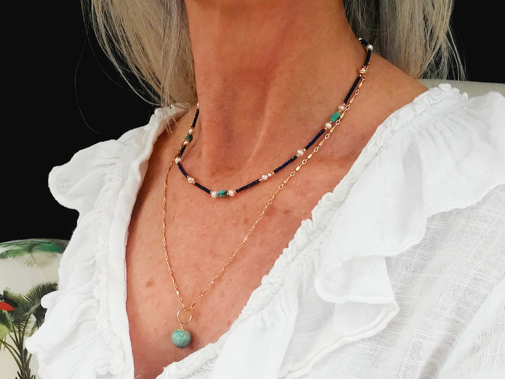The Luxor necklace is a double strand necklace of semi-precious gemstones incorporating tiny stones of faceted lapis lazuli, turquoise, pearls, amazonite, and gold and silver. The strands are connected by small clasps which enable the strands to be separated and worn individually.The amazonite pendant can be removed and worn on a simple gold chain of your own (not included), and layered with the choker. The pearls have been traditionally knotted by hand on silk allowing it to drape beautifully.