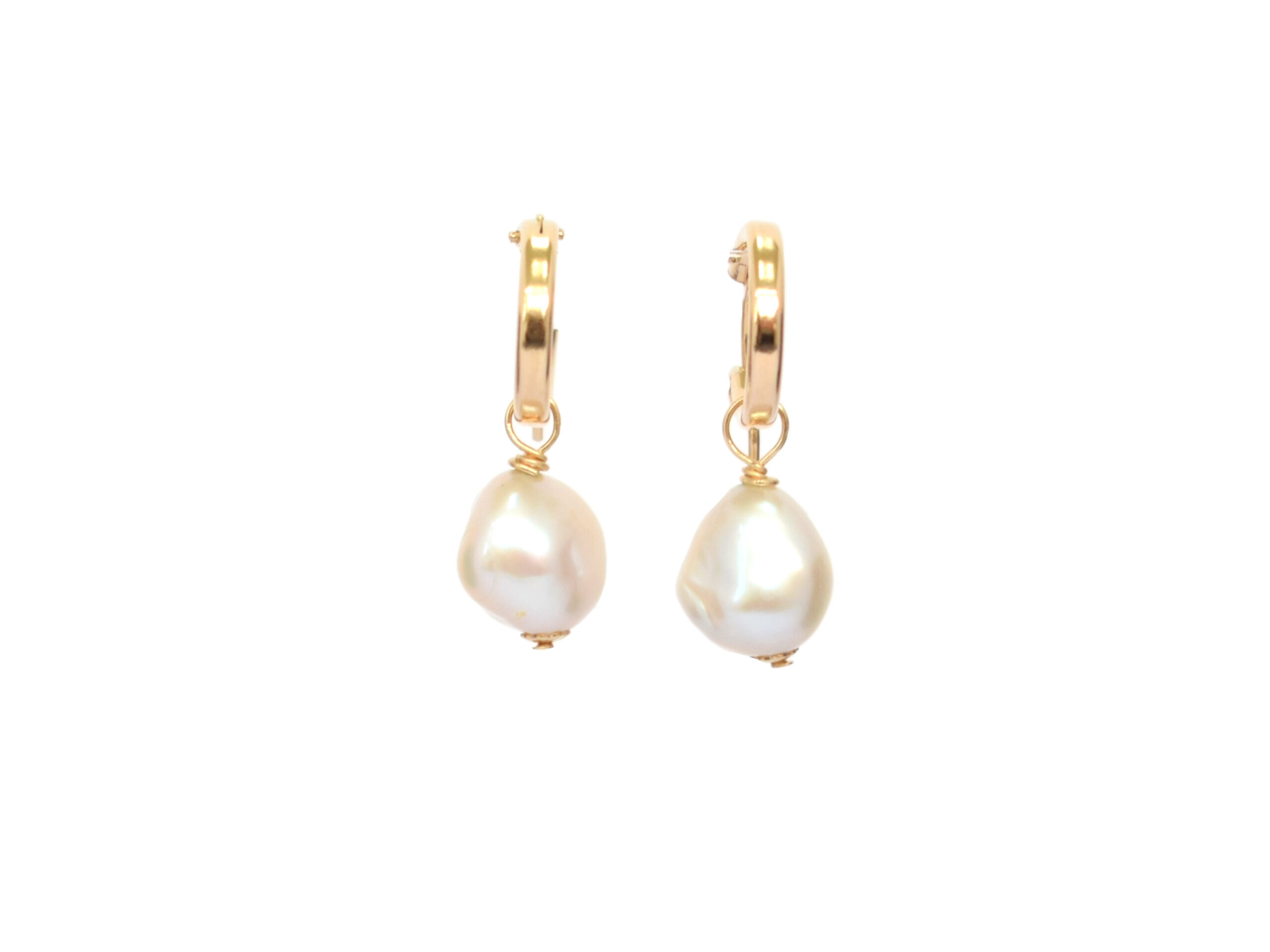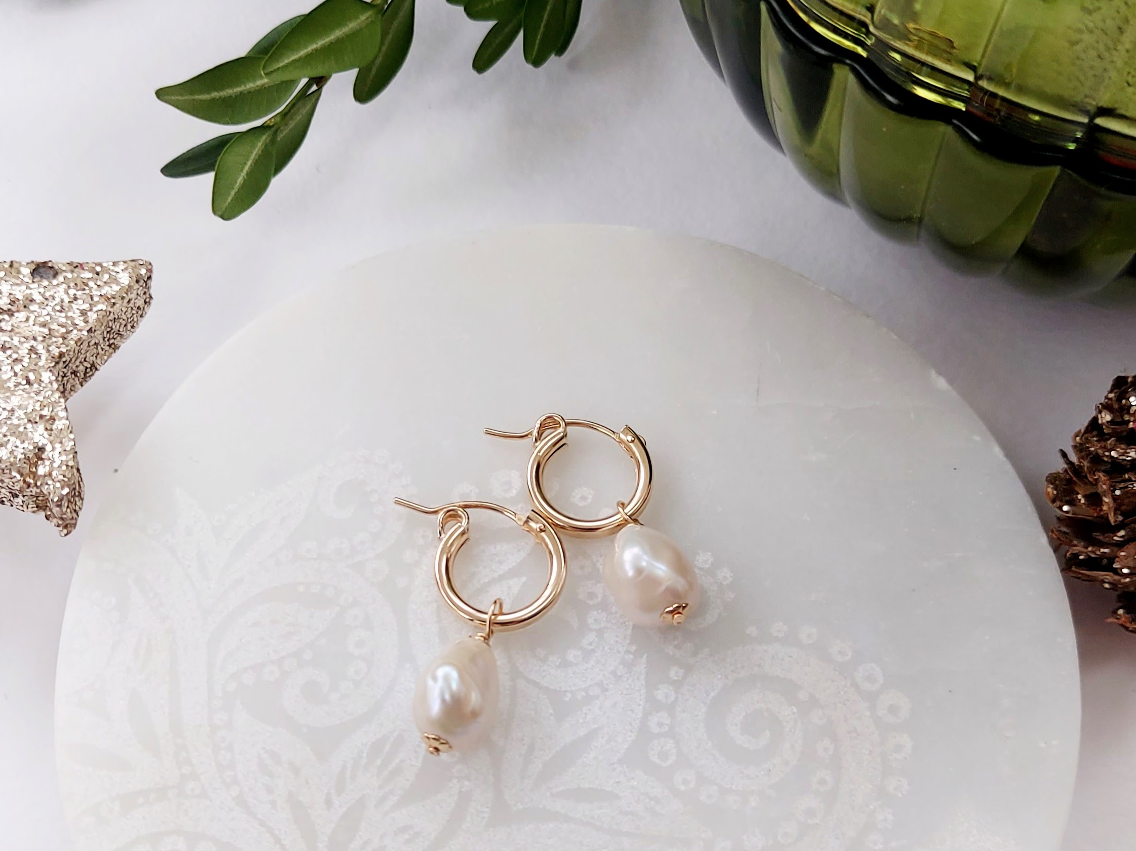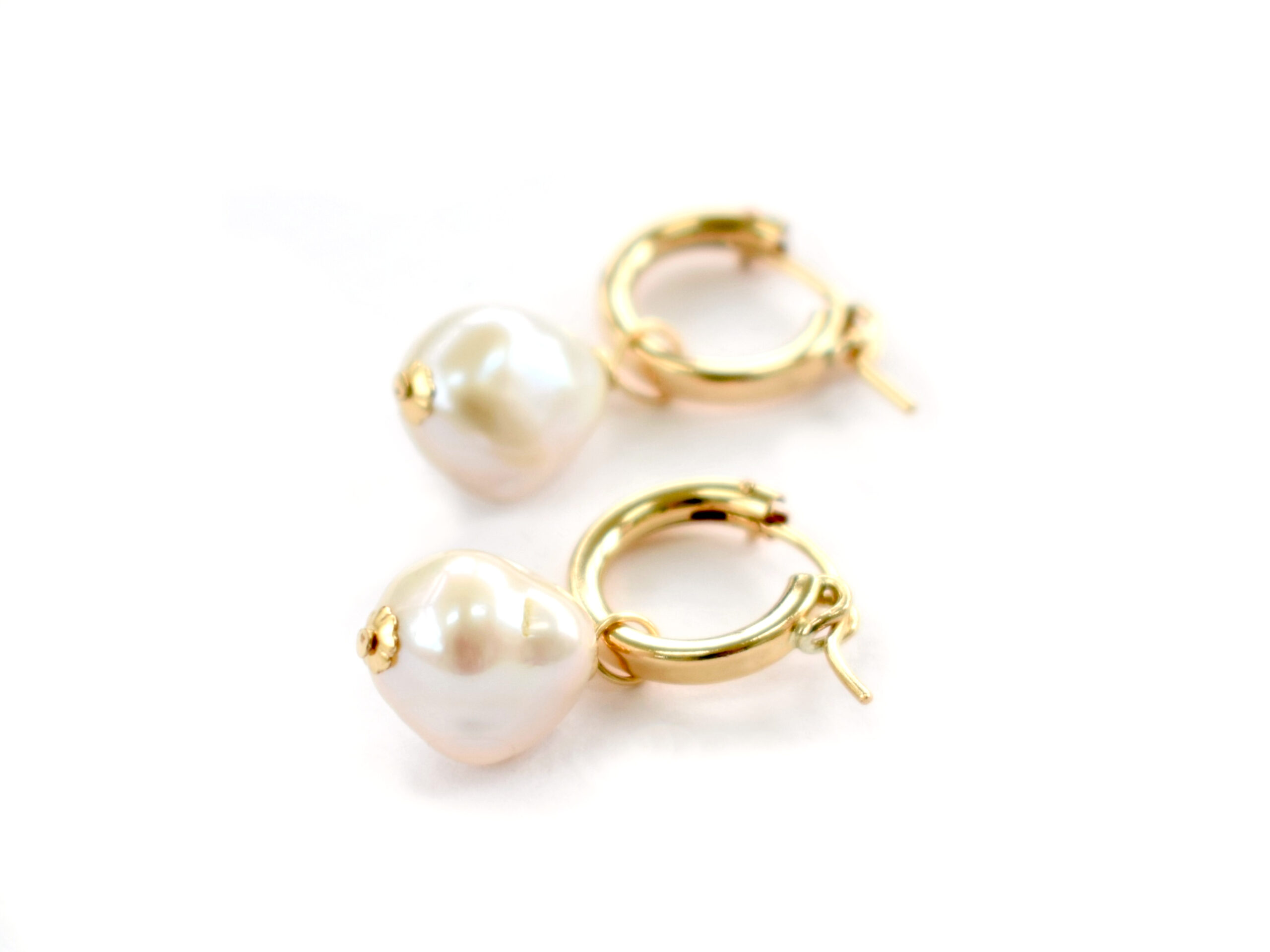 These lovely individually shaped baroque pearls are super lustrous and a perfect neutral for any of your outfits. Hanging in a drop from 14k gold filled hoops, they create a polished look for any time of the day or evening. The pearls can even be removed if you wanted to style your outfit with just the gold hoops.